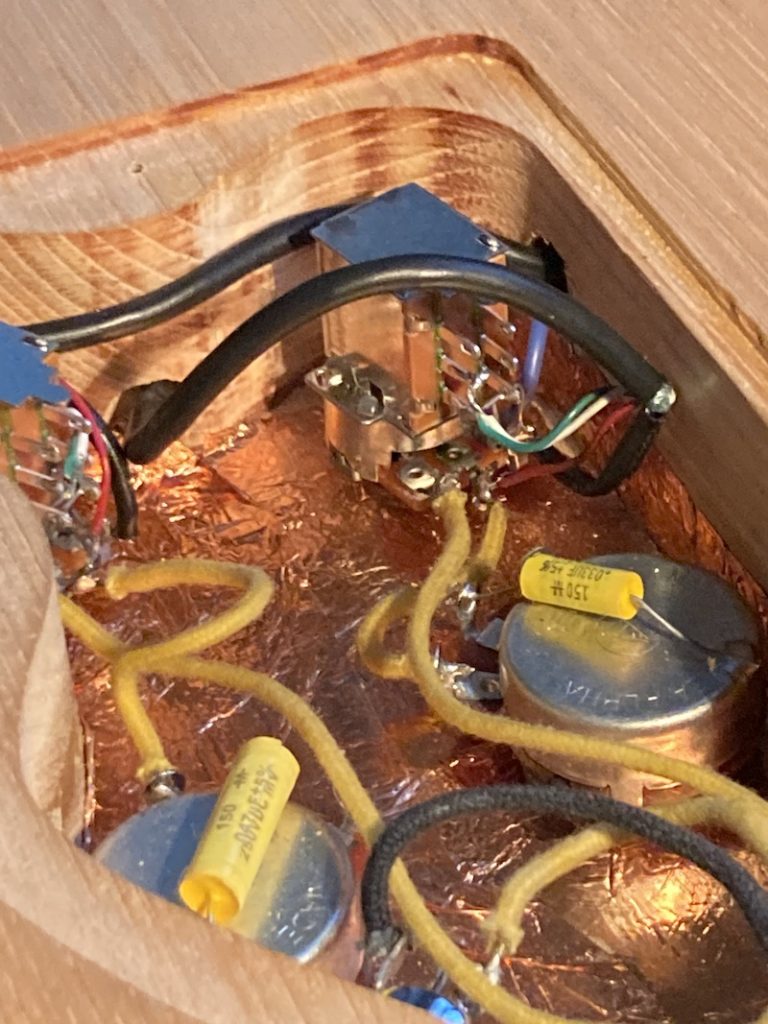 L’inconvénient dans ce cas, c’est qu’en position médiane du commutateur, lorsque les deux micros sont sollicités en même temps, les curseurs des 2 potentiomètres sont reliés électriquement. Donc dès que l’un des volumes de volume est à zéro, l’autre l’est aussi. C’est assez désagréable dans certaines situations.