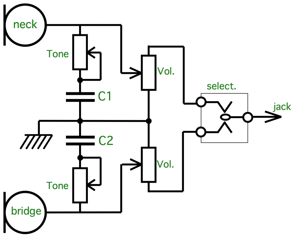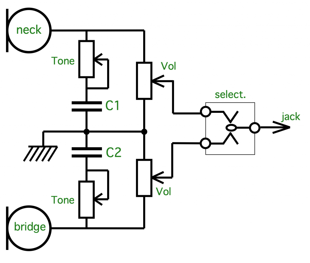 Le câblage habituel correspond au schéma ci-contre. Sortant de chaque micro, le signal est corrigé par le filtre RC constitué du potentiomètre de tonalité et du condensateur. En modifiant la position du curseur, on atténue plus ou moins les aigus. Puis le signal arrive au potentiomètre de volume, dont le curseur prélève une partie ou la totalité pour la diriger vers la sortie, le jack de branchement vers l’ampli.