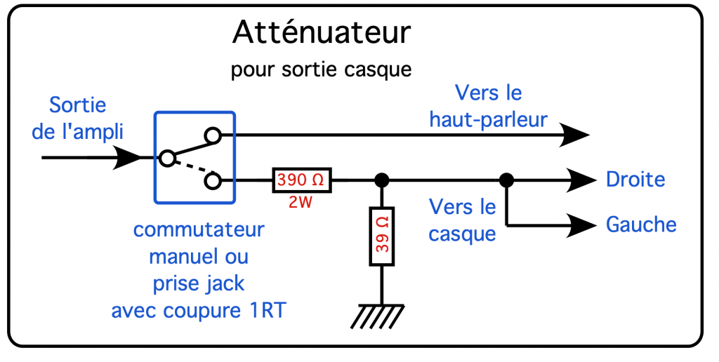 L’atténuation se fait par un pont de résistances de puissance. On a ici un rapport de 1 à 10 (atténuation de 10dB), on peut prévoir plus si on craint pour ses oreilles mais en principe c’est bon en jouant sur le volume de sortie de l’ampli.